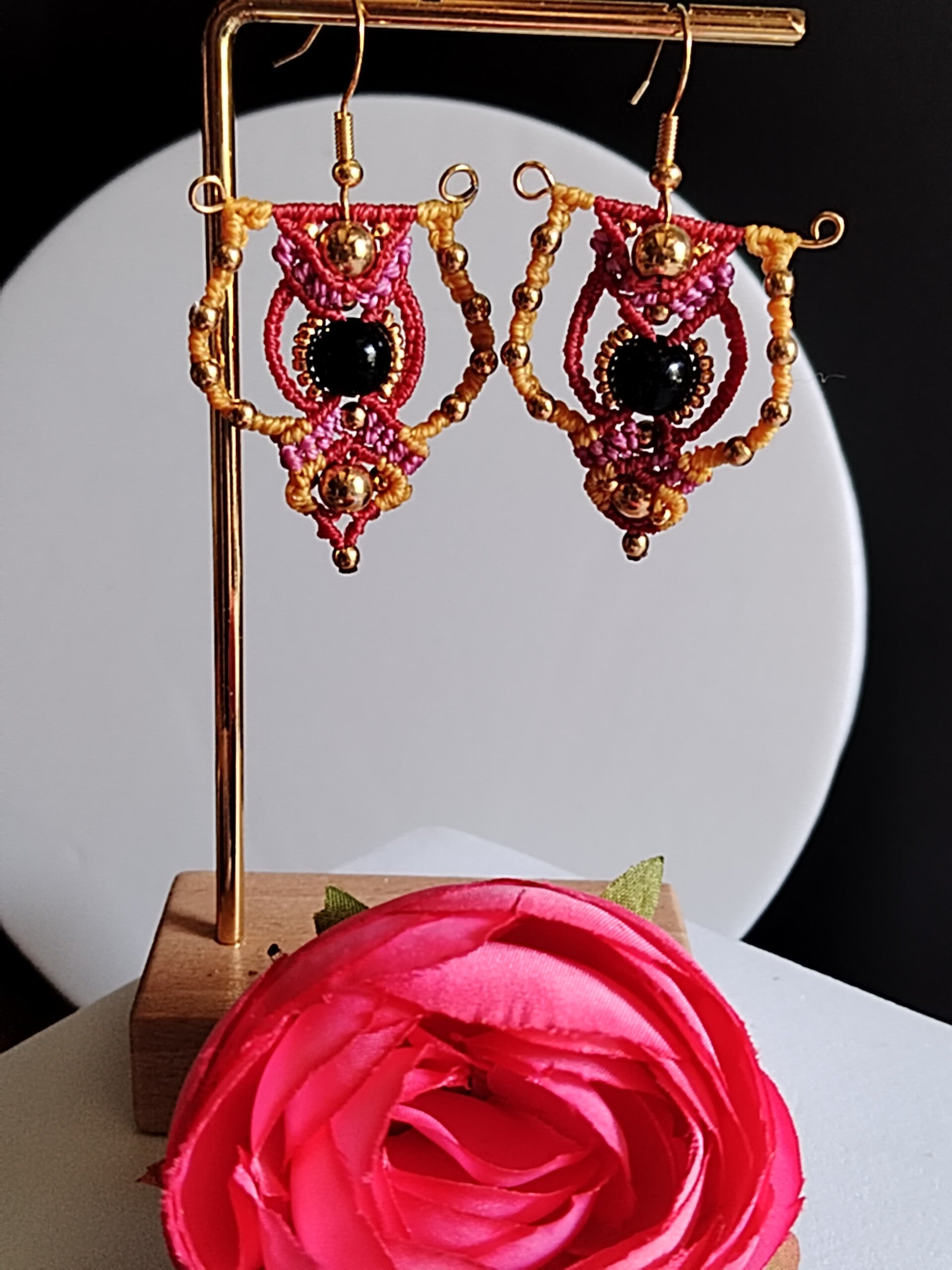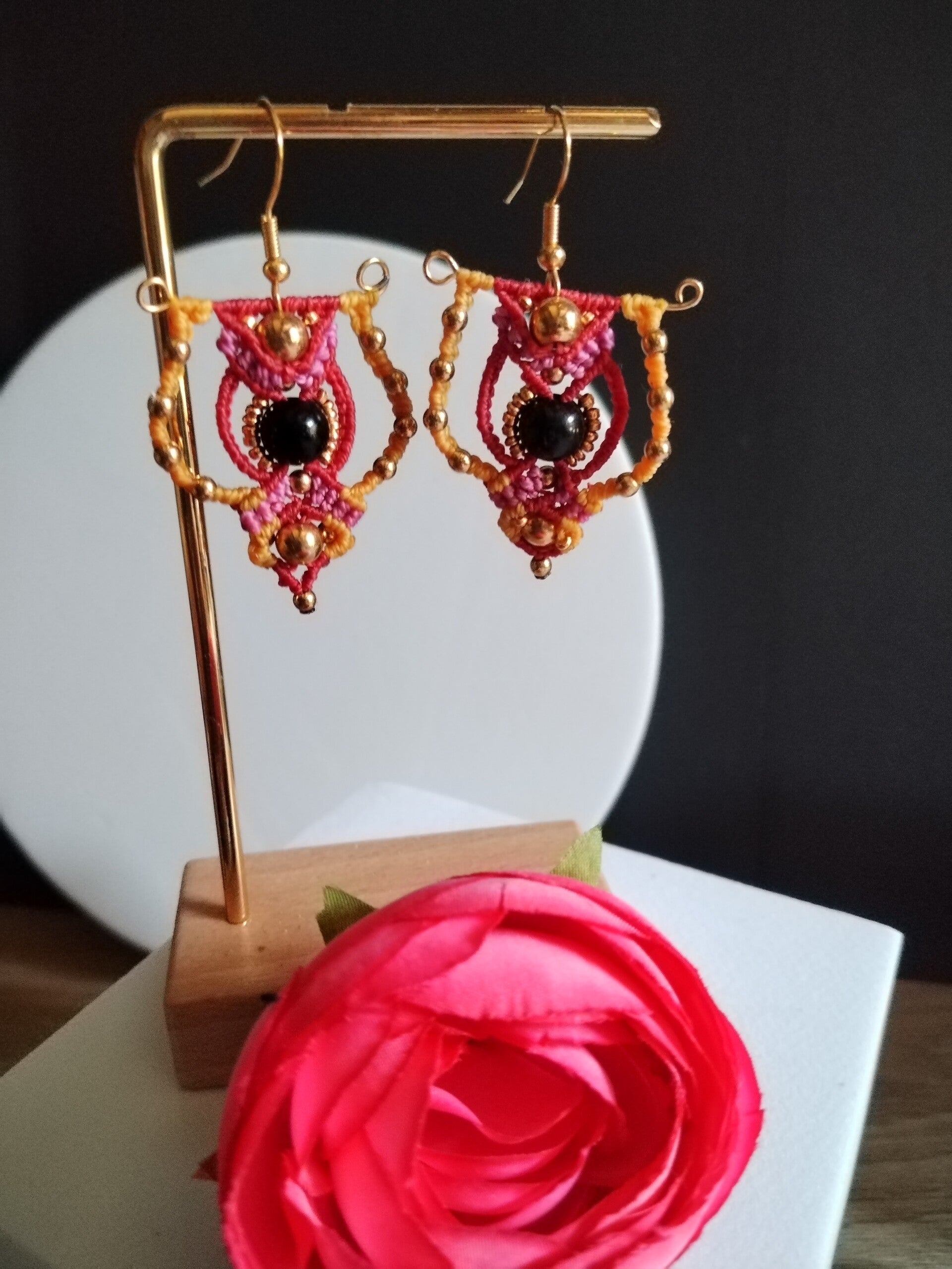 Boucles d'oreilles couleur champagne en fil polyester cirée,les perles et les tiges sont en acier inoxydable doré et enverre pour la perle central.