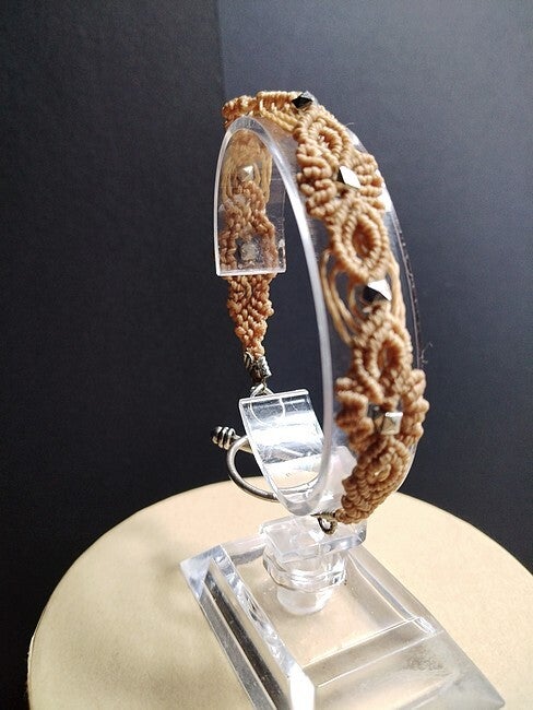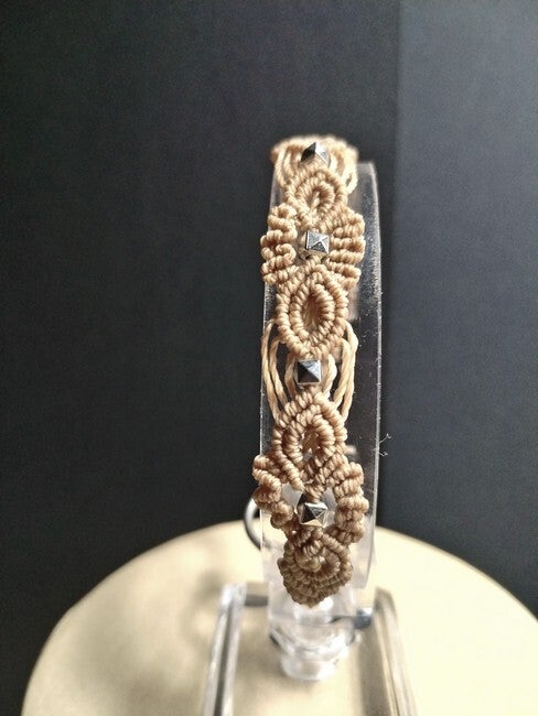 Bracelet micro-macramé couleur Camel en fil polyester cirée et perle acier inoxydable, il va à tous les poignés grace à sa fermeture réglable. Fabriqué en france fait main.