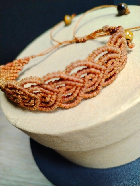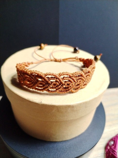 Bracelet micro-macramé couleur camel en fil polyester cirée, il va à tous les poignés grace à sa fermeture réglable. Fabriqué en france fait main.