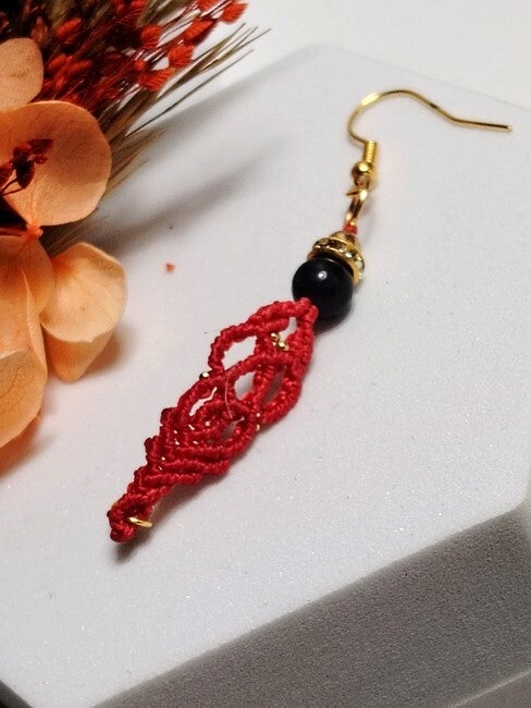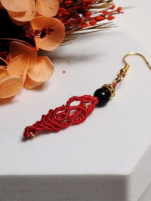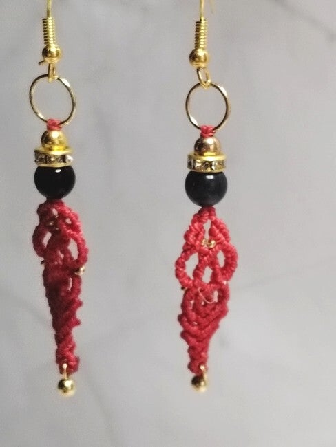 Boucles d'oreilles micro macramé fantaisie bohéme.Modèle unique fabriqué main en fil polyster enduit et acier inoxydable et perle de verre.