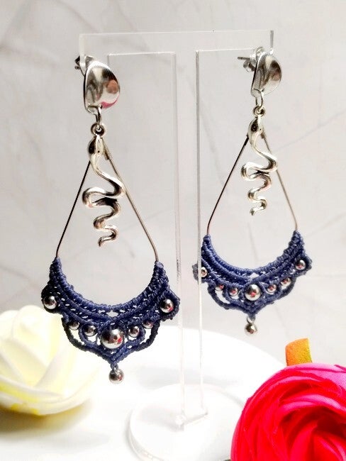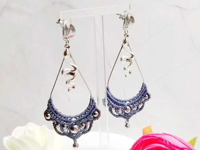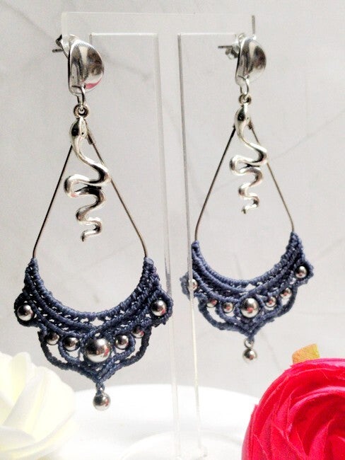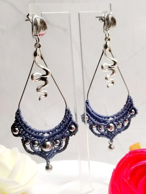 Boucles d'oreilles micro macramé fantaisie bohéme.Modèle unique fabriqué main en fil polyster enduit et acier inoxydable.
